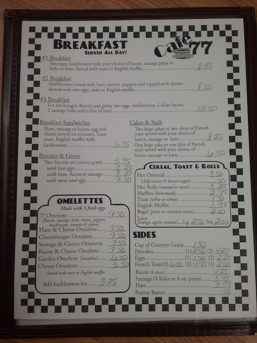 Cafe 77 specializes in American cuisine, with a menu designed to cater to all flavor profiles and cravings. Start your culinary journey with their appetizing starters, including crispy Onion Rings and zesty Jalapeno Poppers, all perfect for sharing or enjoying solo. As you flip through the breakfast offerings, don’t miss the fluffy Silver Dollar Cakes paired with perfectly seasoned sausage or bacon – a nostalgic treat that’s sure to awaken your senses.